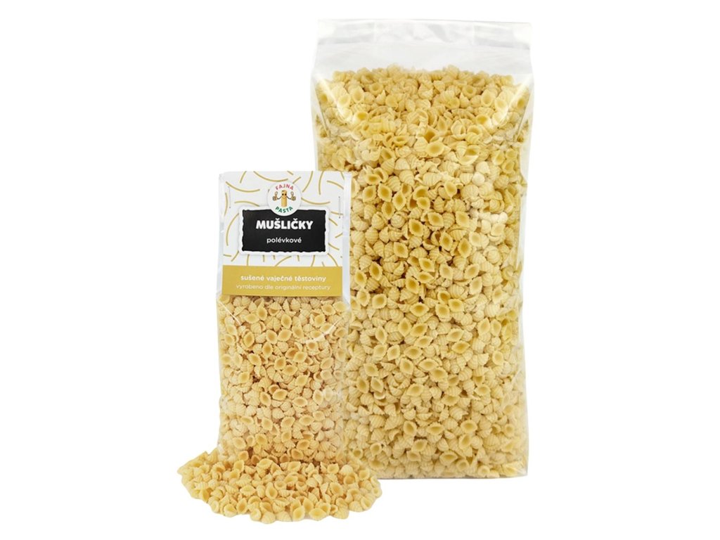 Polévkové mušličky si u vás získaly takovou oblibu, že jsme je rovnou zabalili i do velkého balení pro celou rodinu. Tyhle drobné těstoviny ve tvaru lasturek pro vás vyrábíme z pšeničné a semolinové mouky, takže mají sytější barvu a pevnou strukturu. A jako ostatní naše polévkové těstoviny, jsou i mušličky vaječné, s bohatou chutí a jemnou konzistencí. Nejen díky jejich krásnému tvaru je milují děti i dospělí.