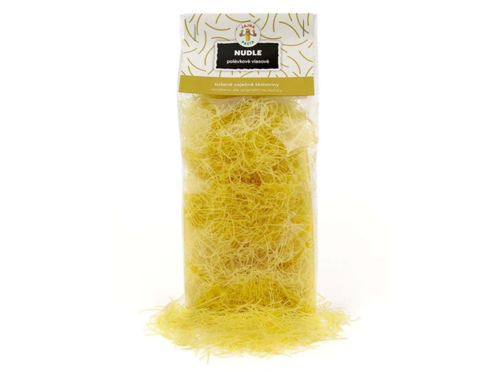 Vlasové polévkové nudle jsou extra tenké těstoviny, které dodají každému vývaru tu správnou jemnost. Patří mezi nejoblíbenější zavářky do vývarů a lehkých polévek. Vyrábíme je z prvotřídního mixu semolinové a pšeničné mouky, takže mají sytější barvu a pevnější strukturu, díky které se tak rychle nerozvaří. Samozřejmě i naše vlasové nudle jsou vaječné, takže mají bohatou chuť a jemnou konzistenci.