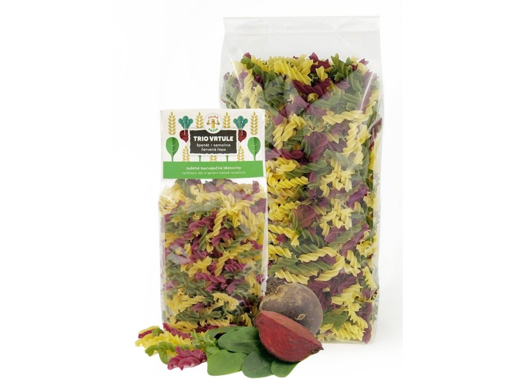 TRIO vrtule (italsky fusili) ve velkém rodinném balení potěší každého milovníka těstovin. Najdete v něm dokonalou kombinaci všech tří druhů našich vrtulí – s červenou řepou, se špenátem i čisté semolinové. Na talíři budou skvěle vypadat a výborně chutnat díky vysokému podílu zeleniny. A díky spirálkovému tvaru perfektně zachytí omáčky i kousky zeleniny.